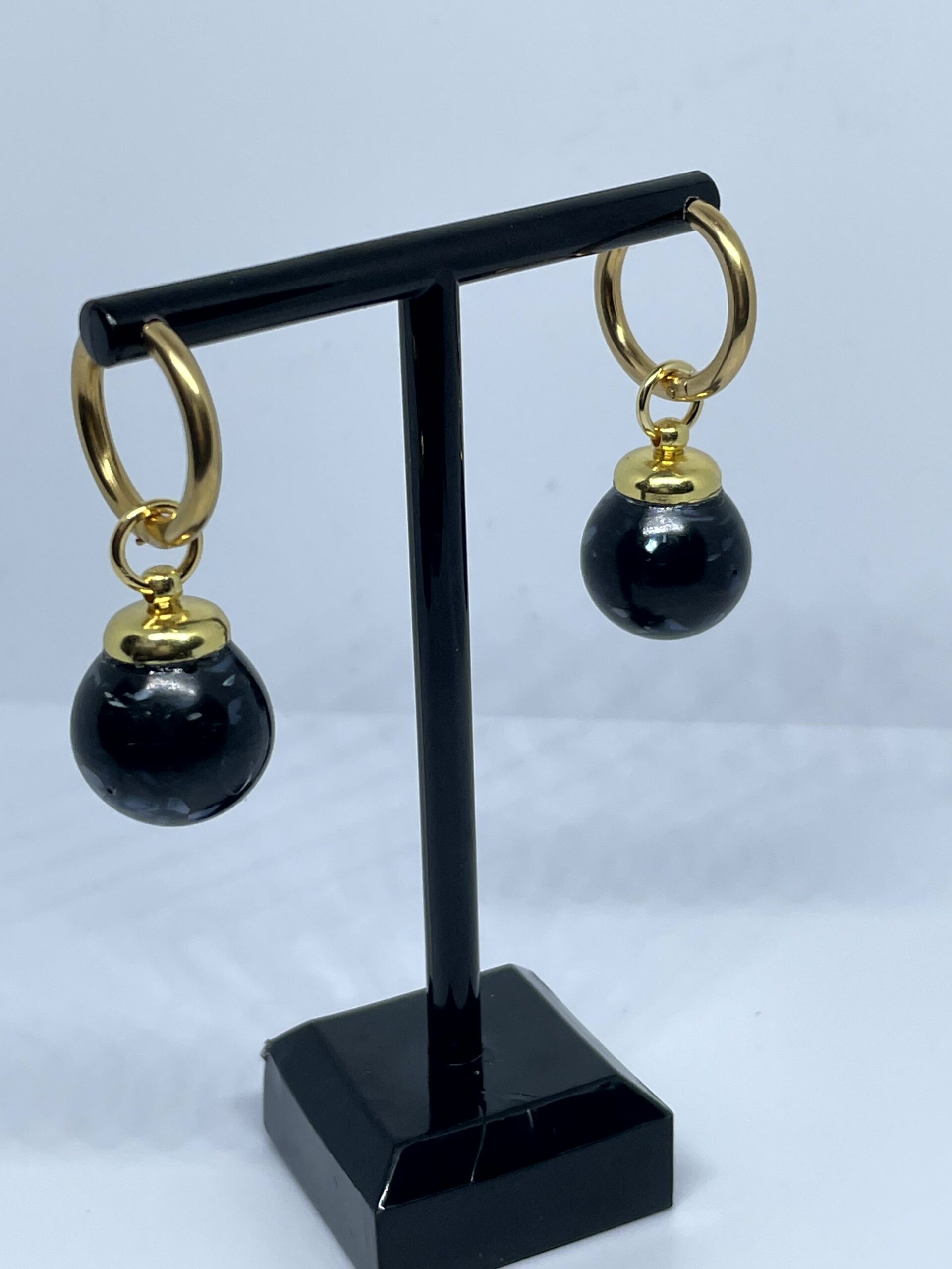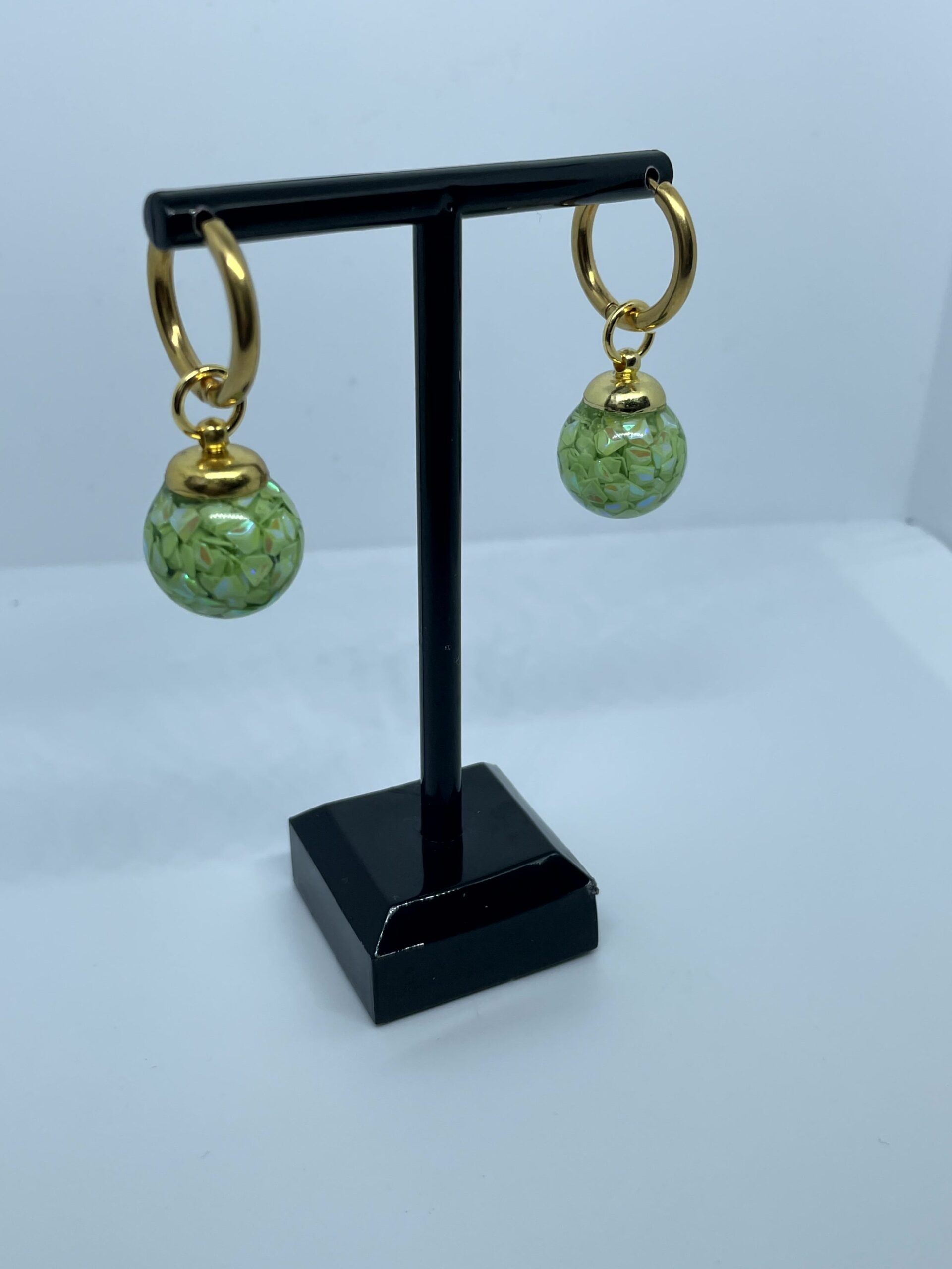 Earrings of resin filled with dark blue diamant shaped strass on a plated hoop. Also available in green.