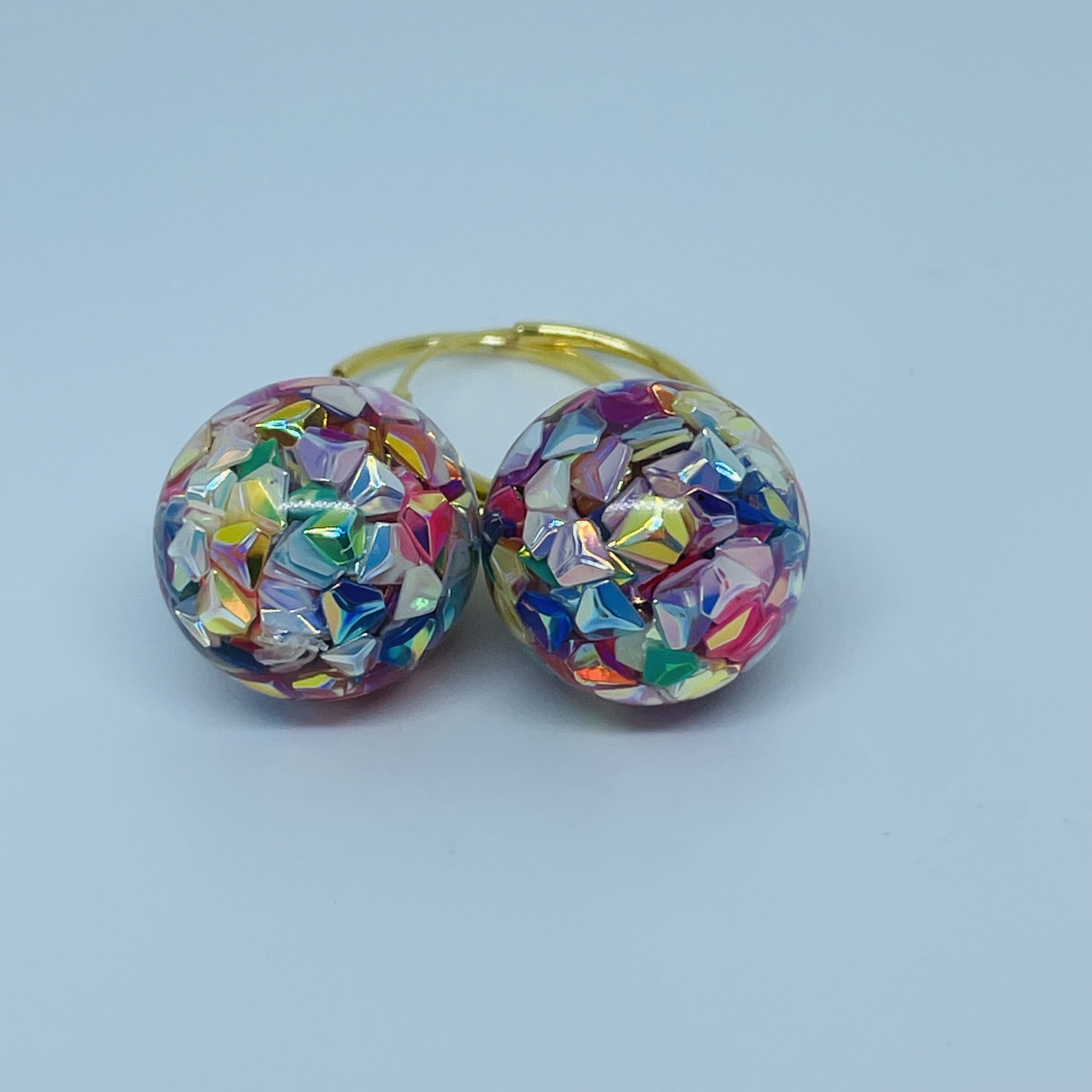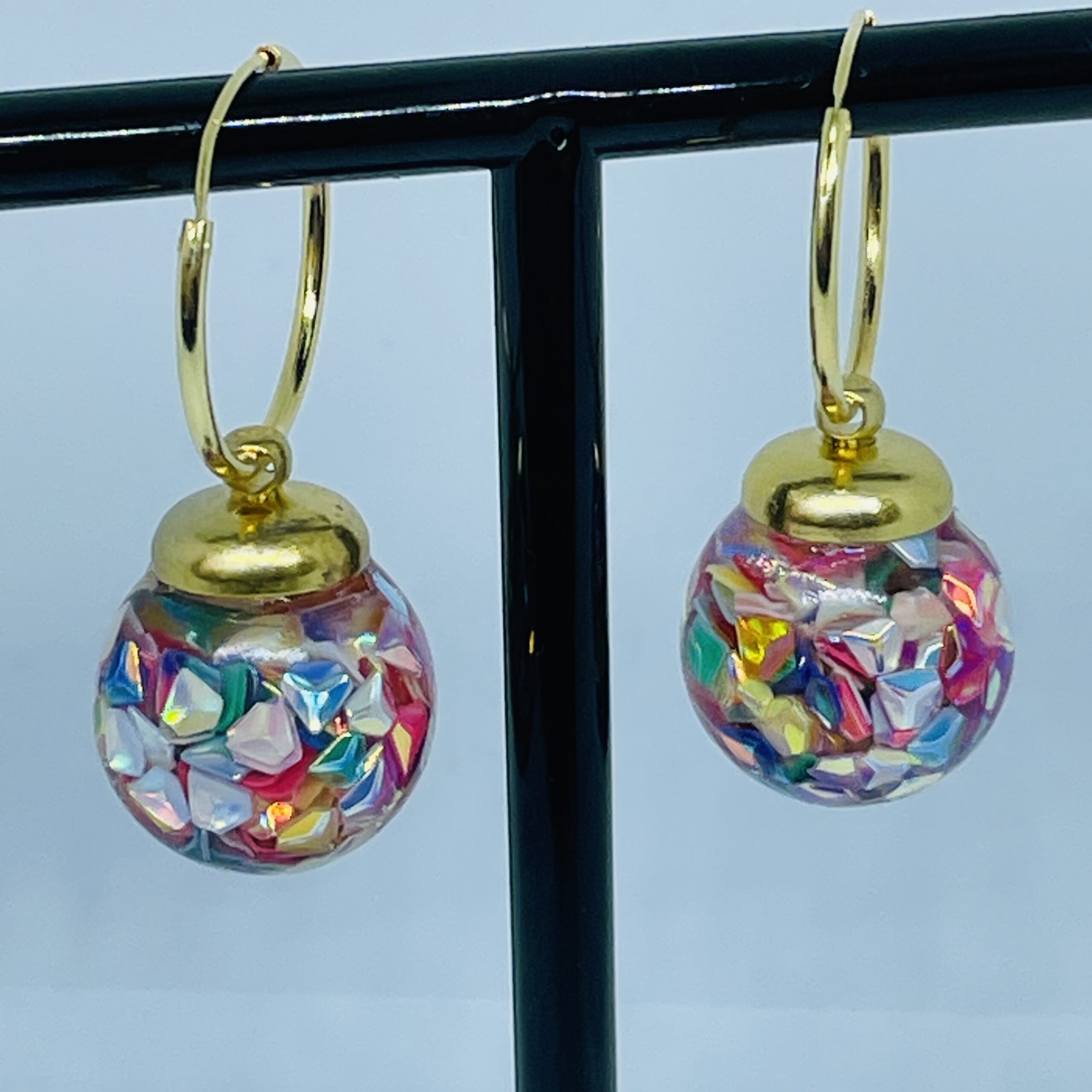 Earrings with resin balls filled with artificial diamonds in rainbow colors on gold plated hoops. Also available in silver plated.