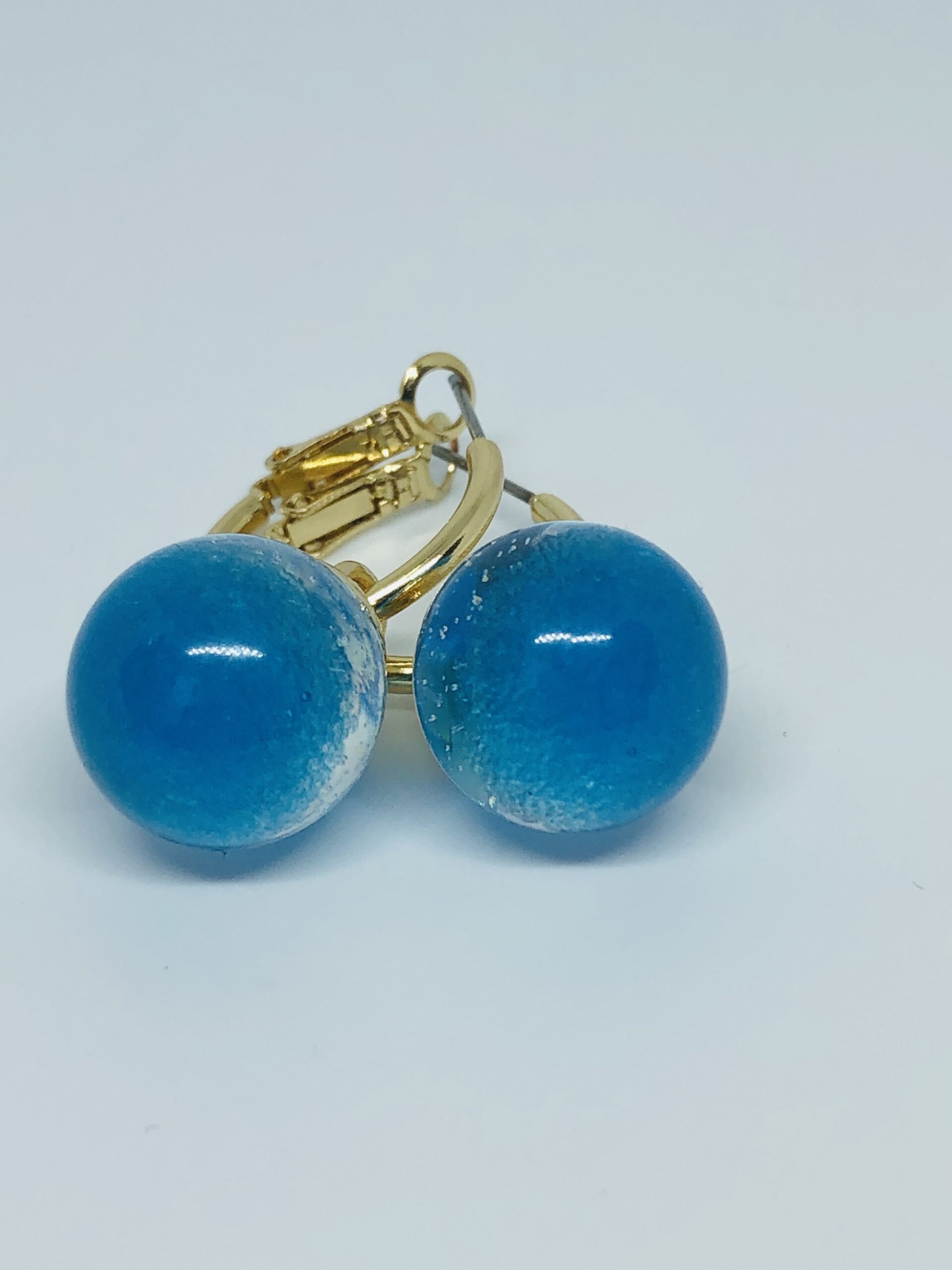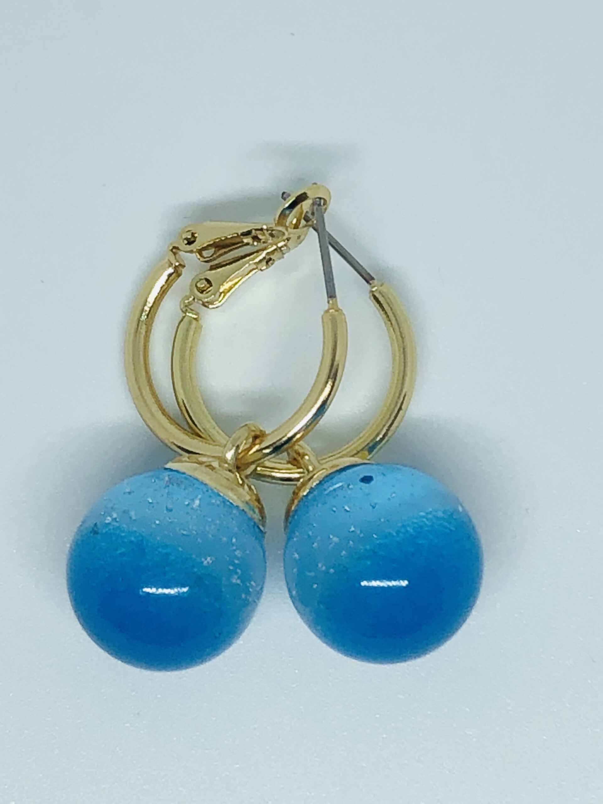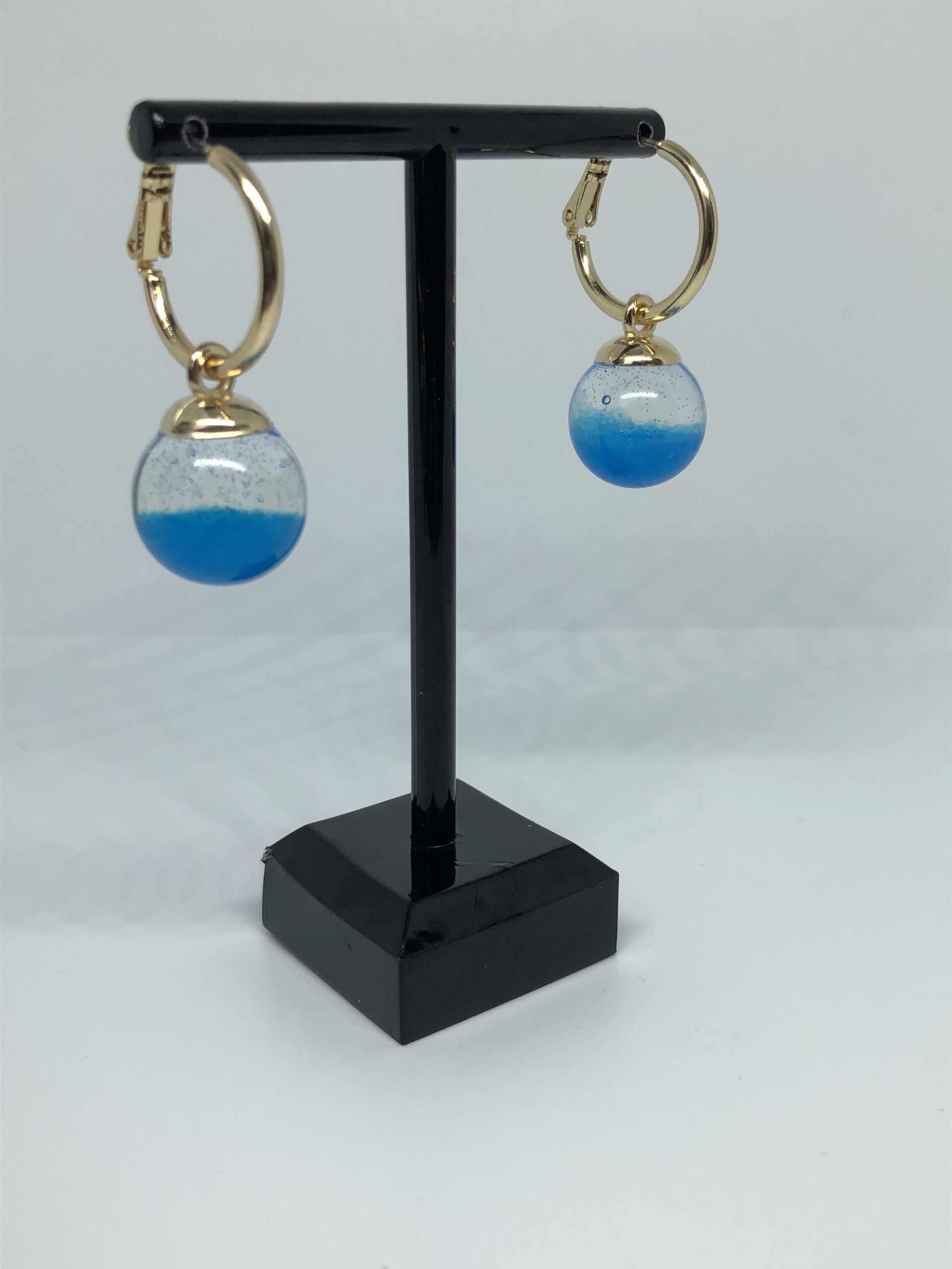 Earrings with balls filled with blue cotton candy sugar on gold plated hoops.