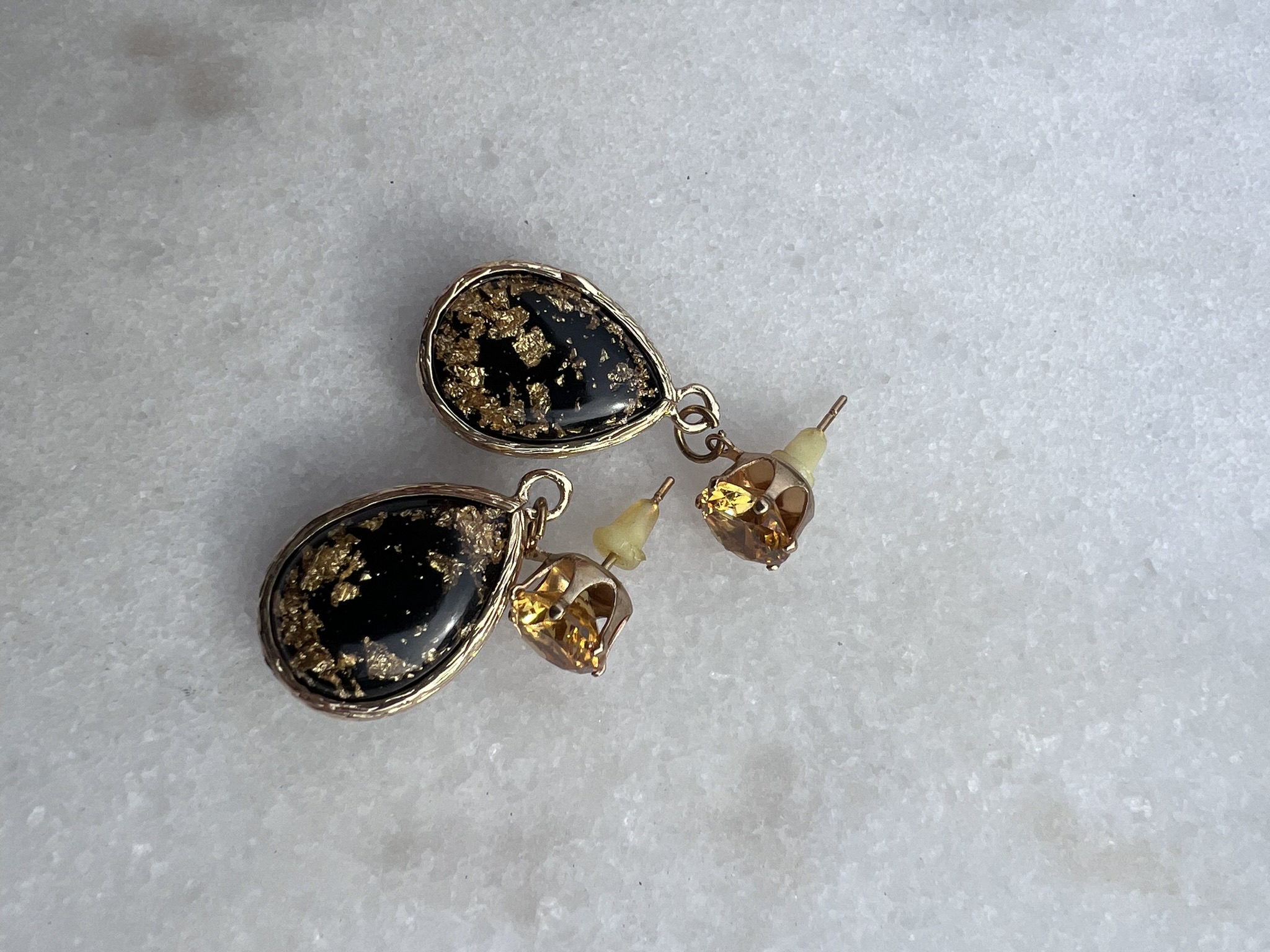 Earrings with gold and black crystal drop on a yellow rhinestone.