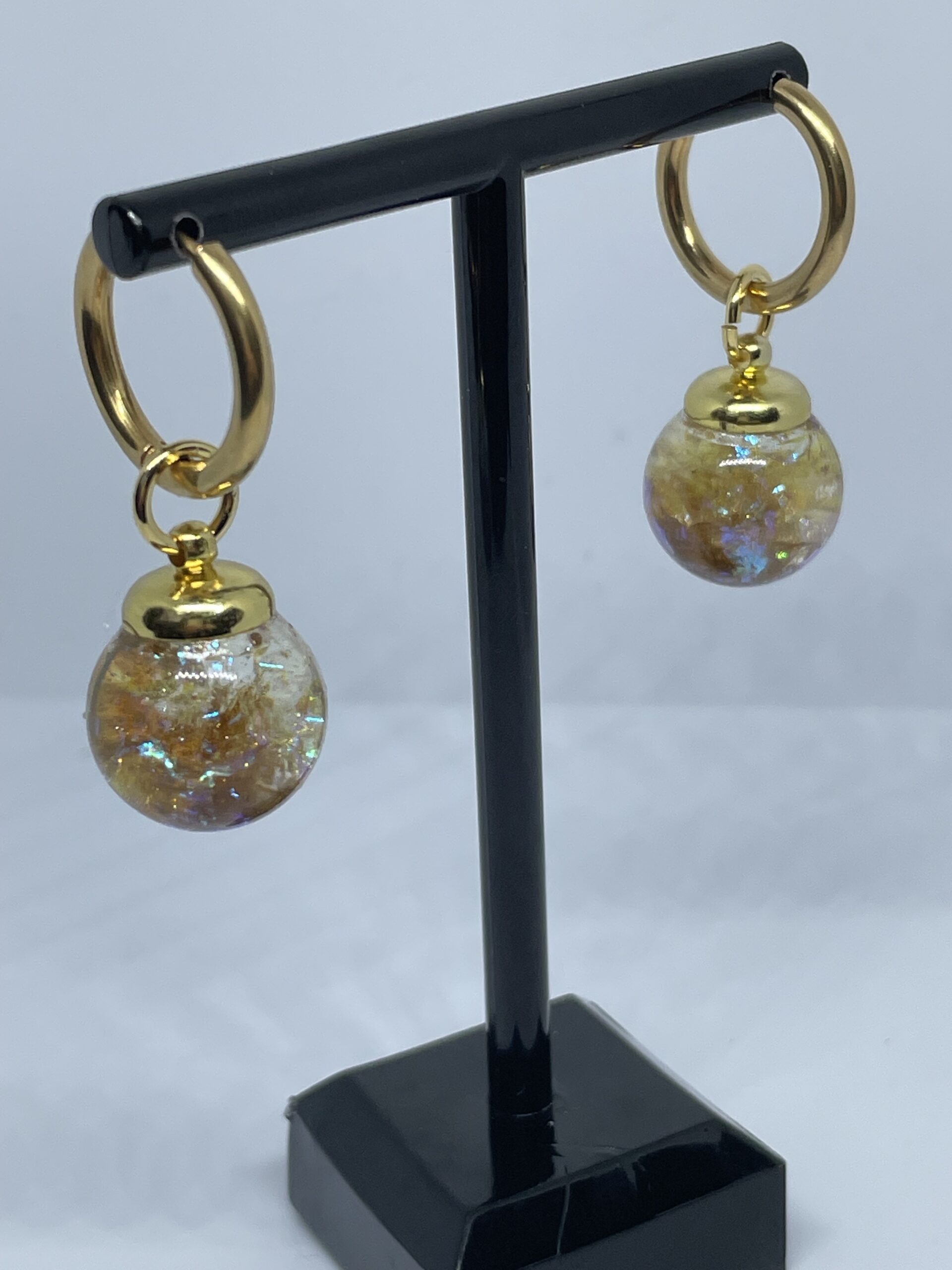 Earrings with balls filled with gold/purple flakes on gold plated hoops.