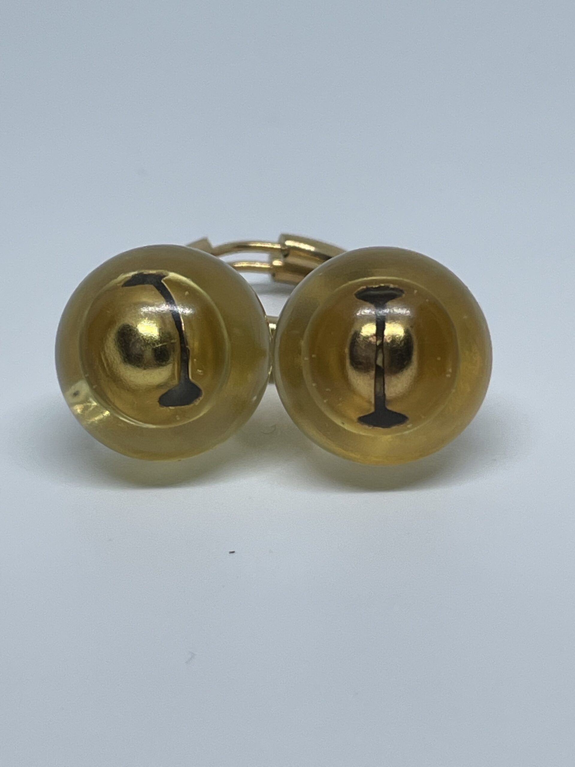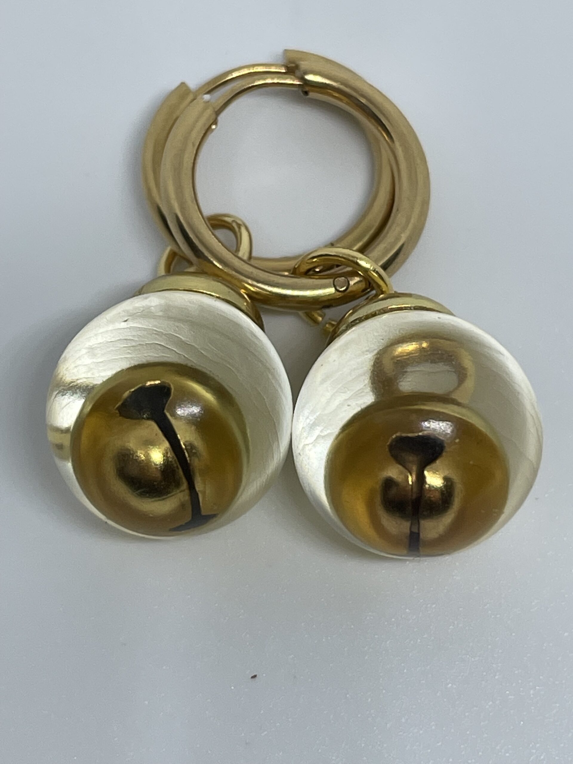 Earrings with balls filled with a jingle bell on gold plated hoops.