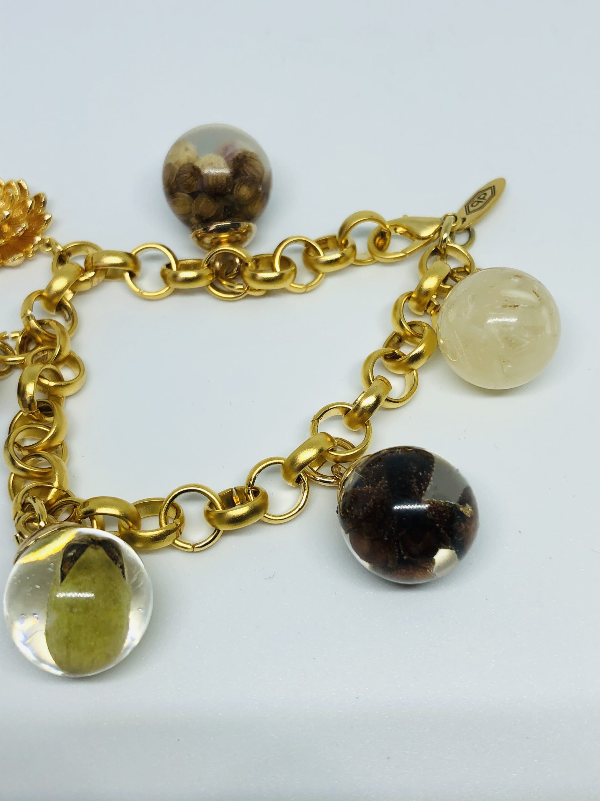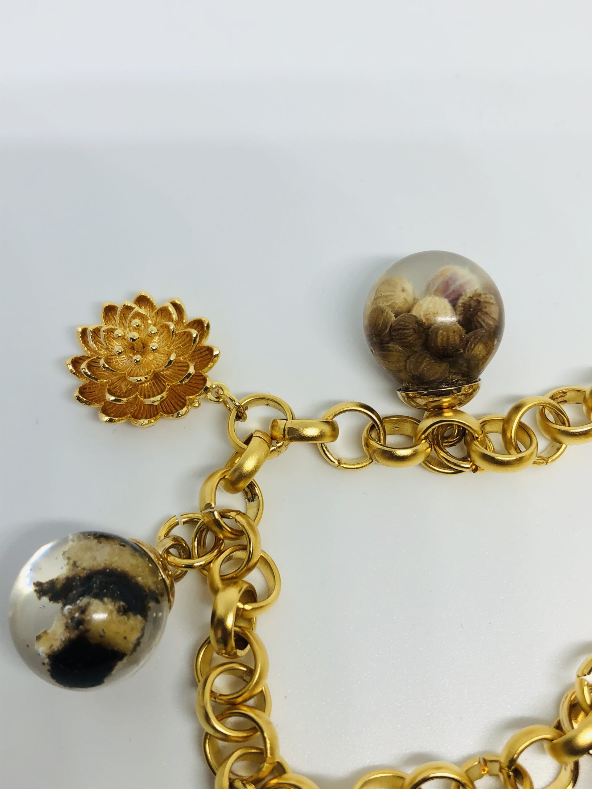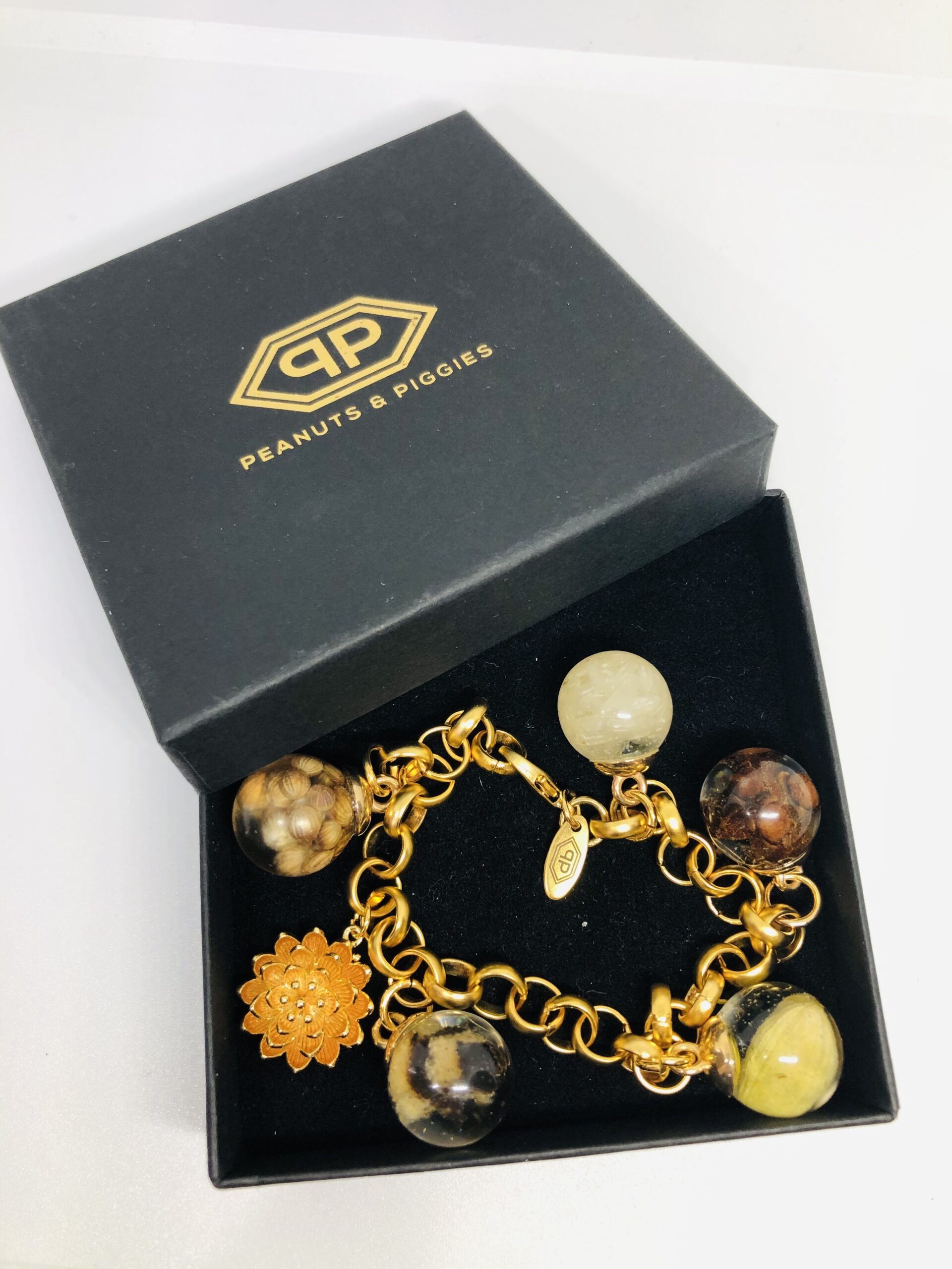 A gold-plated charm bracelet Indian style with ‘spekkoek’, pandan rice, coriander seeds, cardamom, clove and a lotus charm.