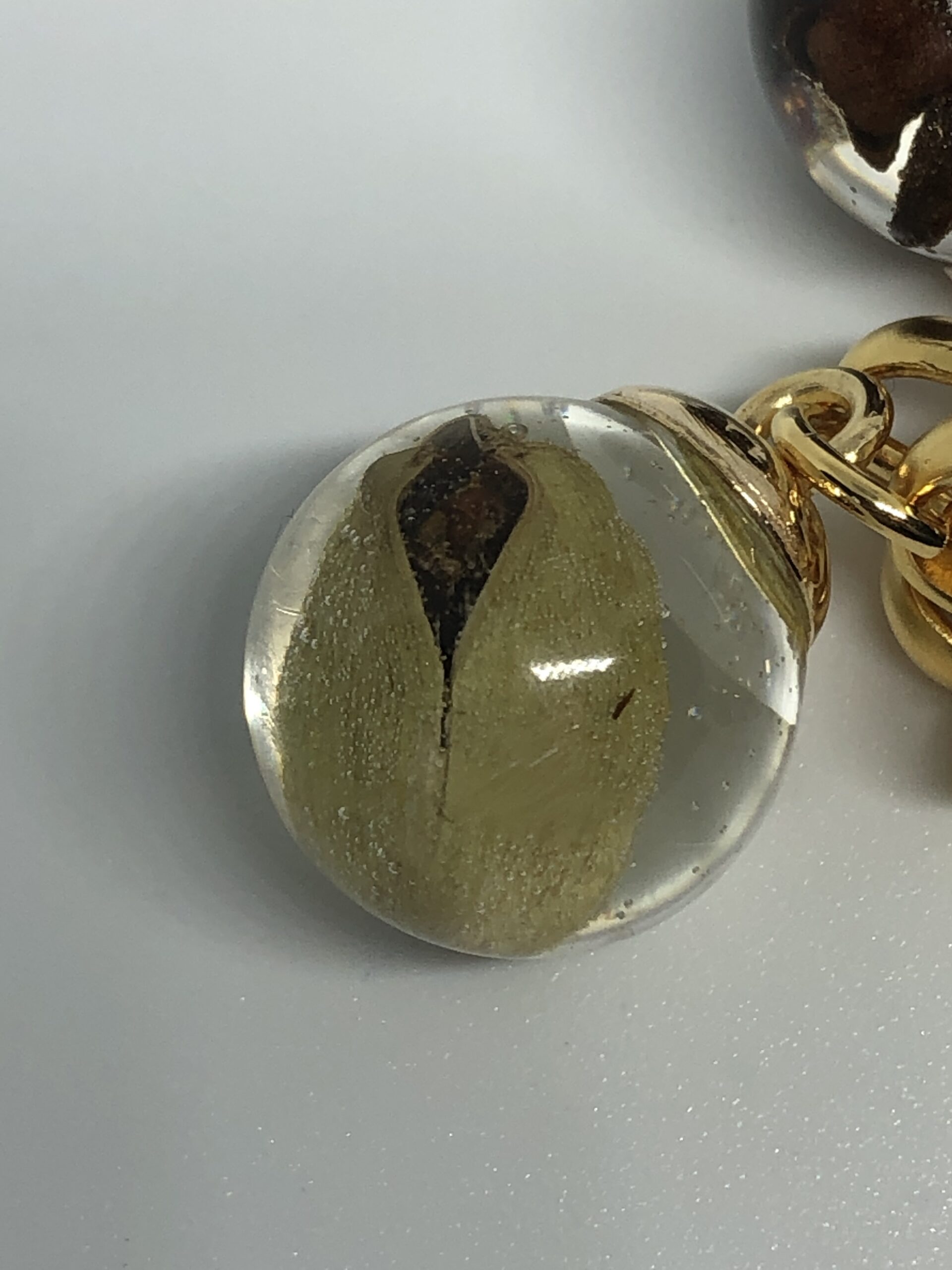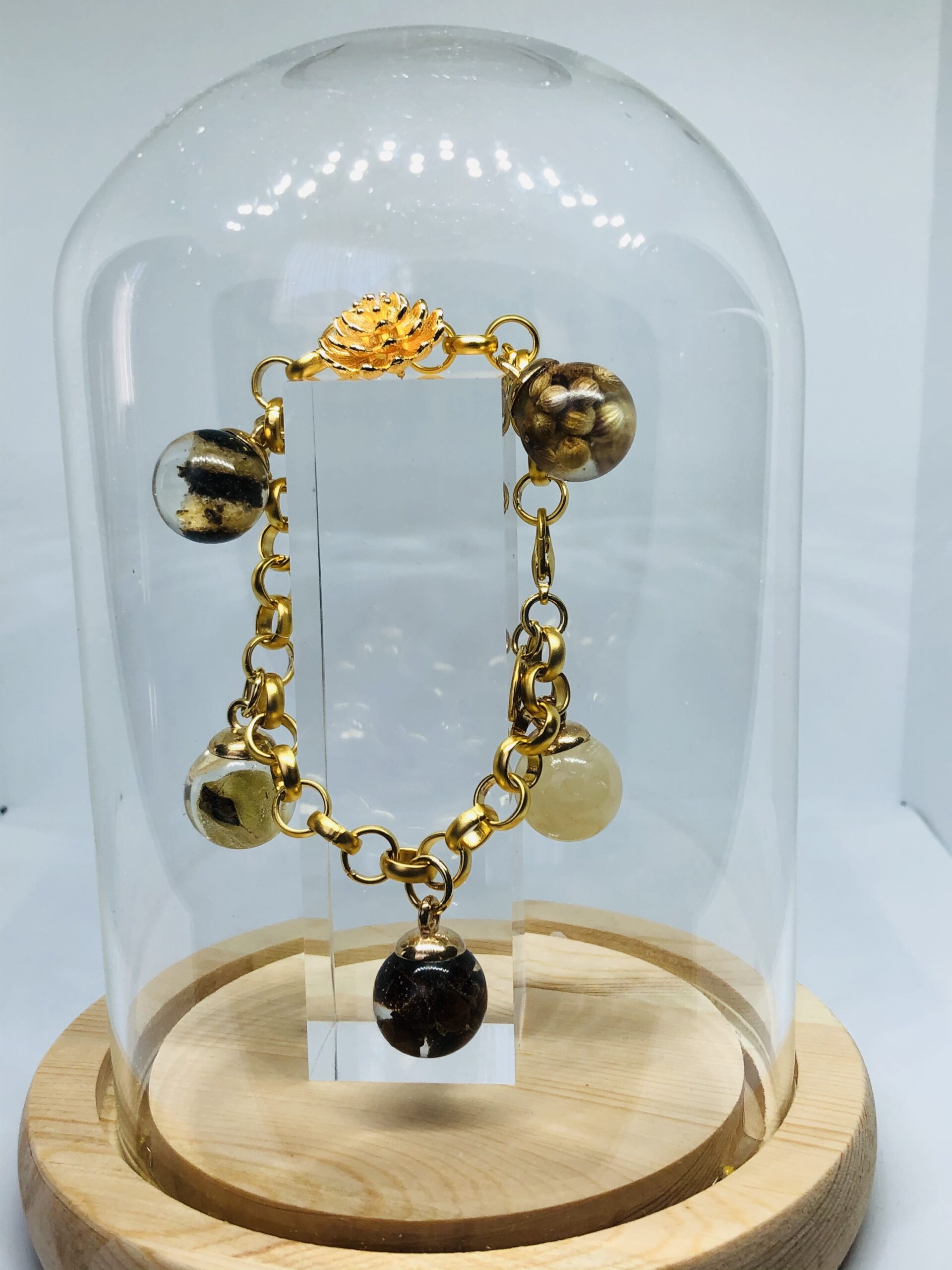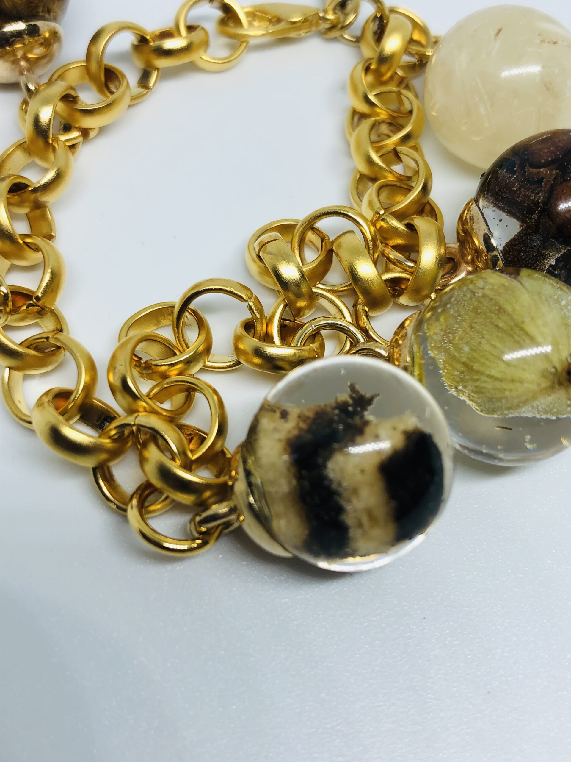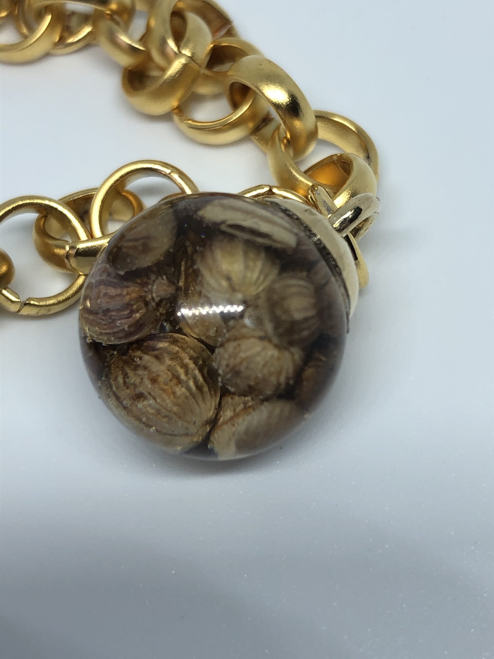 A gold-plated charm bracelet Indian style with ‘spekkoek’, pandan rice, coriander seeds, cardamom, clove and a lotus charm.