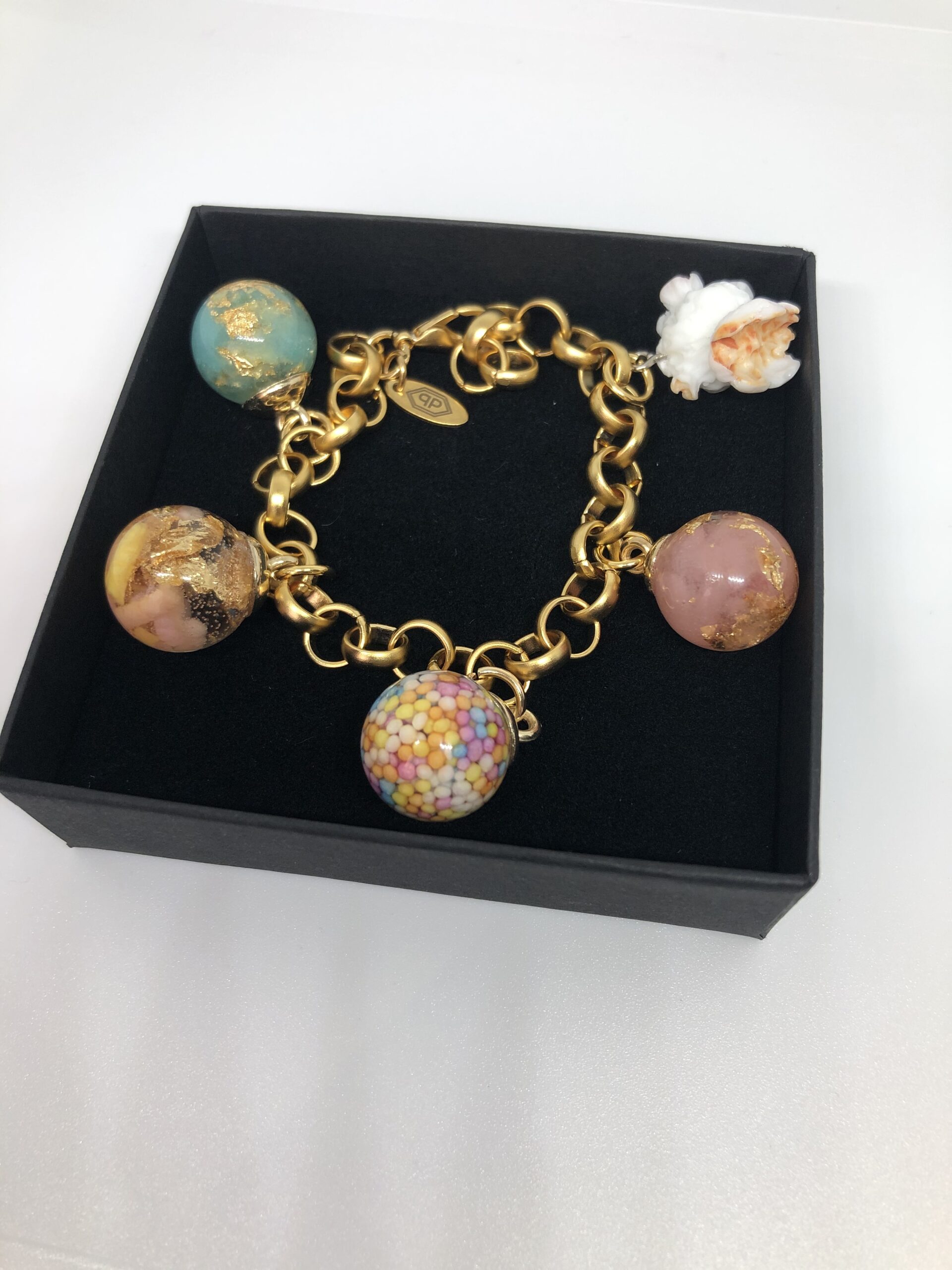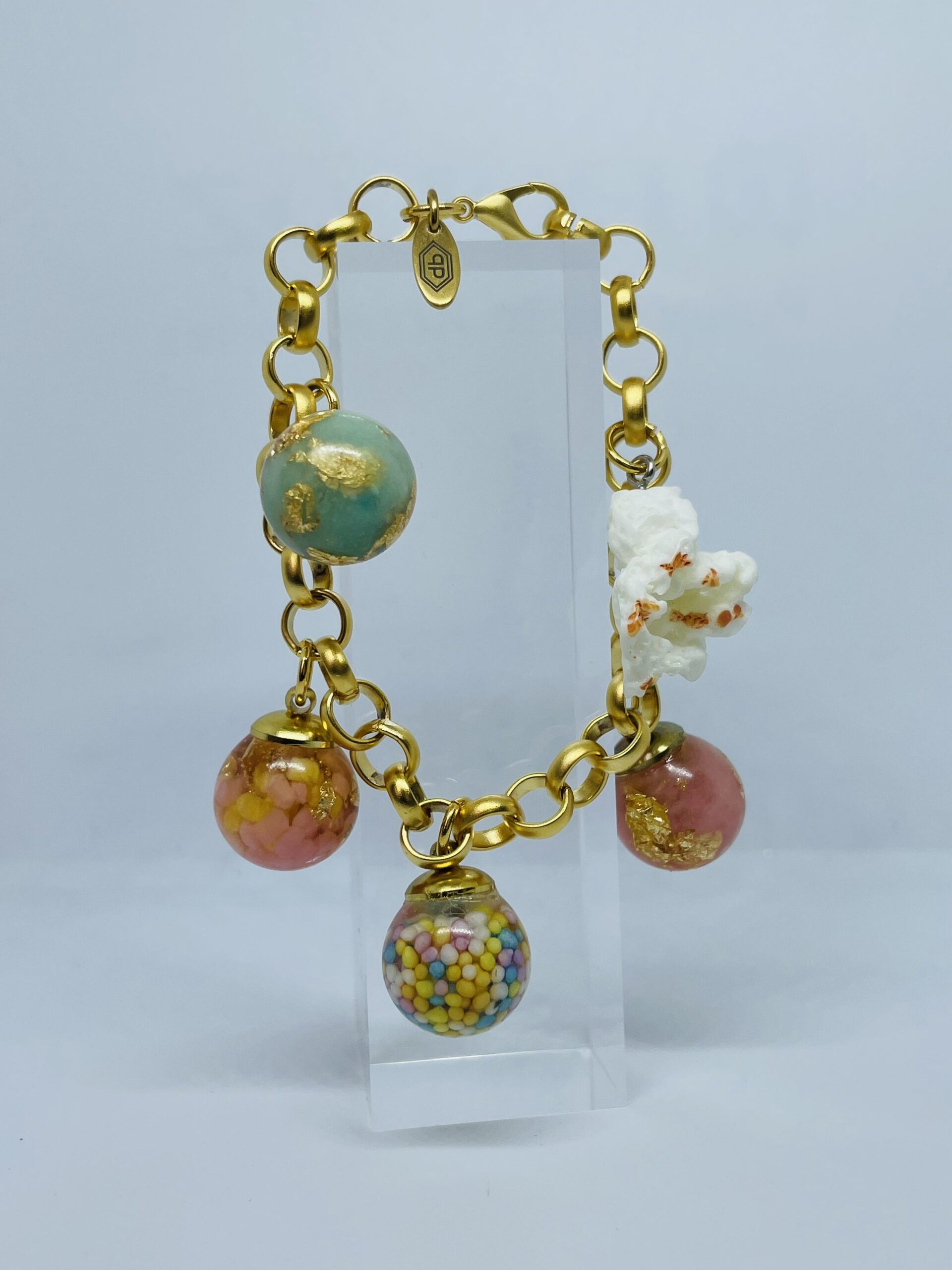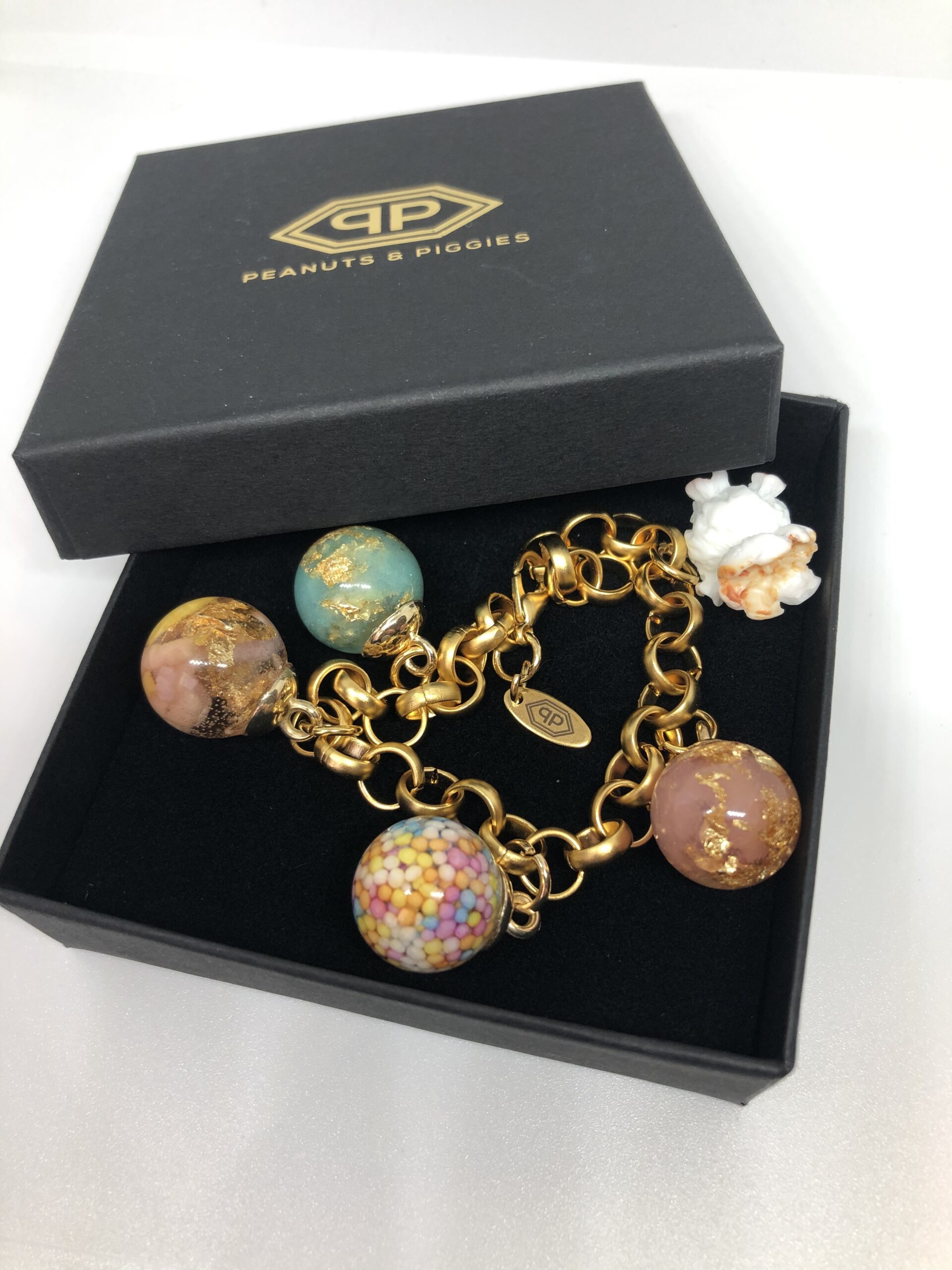 A gold plated charmbracelet with sweat treats like blue and pink candyfloss, discodip and fruit sprinkles topped off with an artificial piece of popcorn.